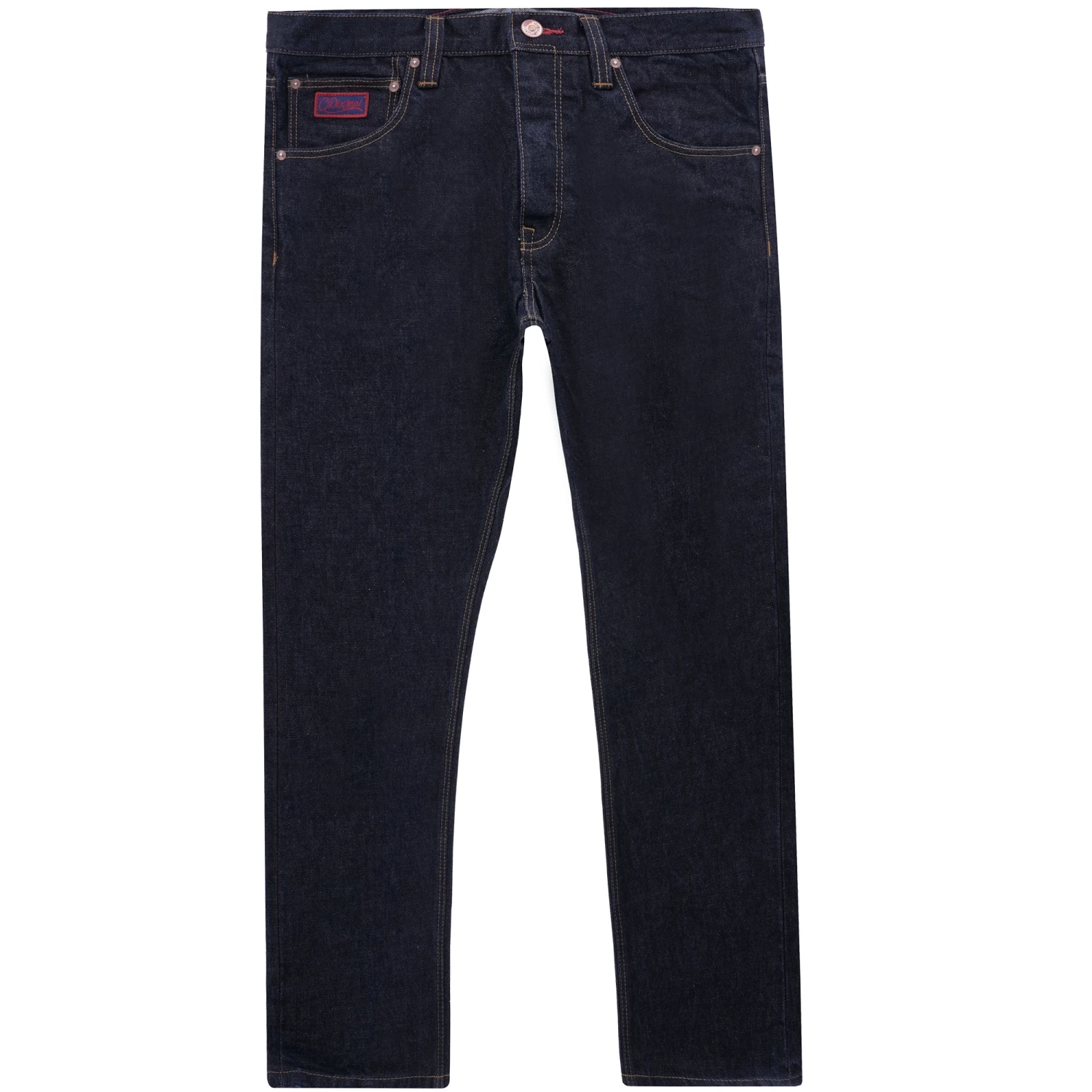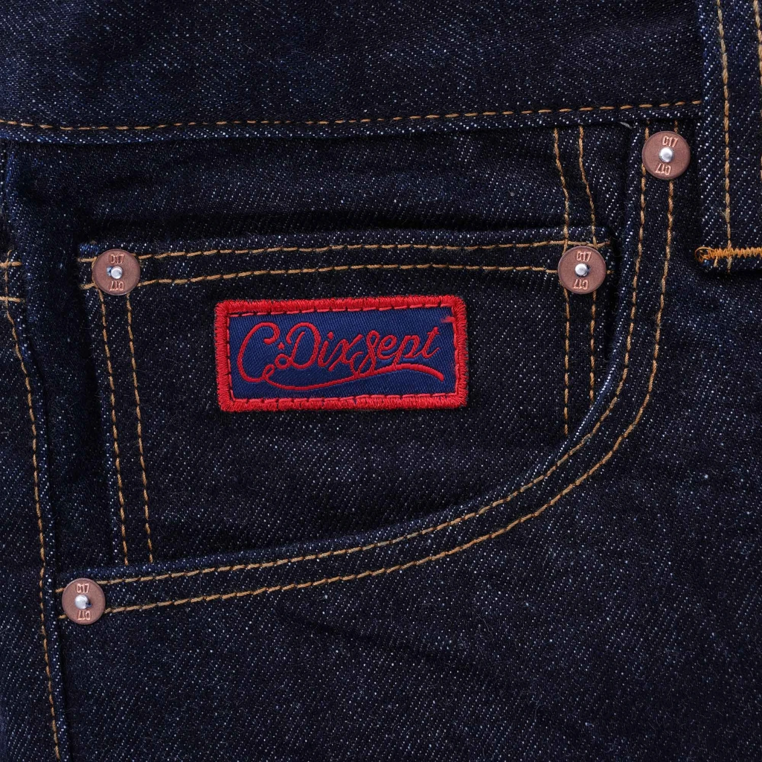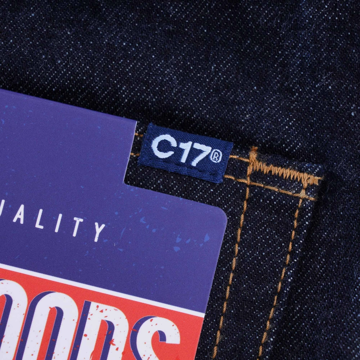 Made from a 16.25oz Japanese selvedge denim from the historic Kaihara denim mill in Japan. The denim is made of 16.5oz Japanese selvedge denim that has been dip-dyed by hand for a consistently dark indigo all over. The denim has also been treated through the wash process to give a lighter feel and give softness to the fabric inside. Tan leather patch on the back with C17 Jeans embossed design, solid brass rivets and buttons and finished with the C17 Jeans navy tab on the rear pocket. The cut of the denim is based on an archival 90s original C17 Jeans but has been slightly modified for an updated fit with a rise that can be worn higher or lower depending on preference.