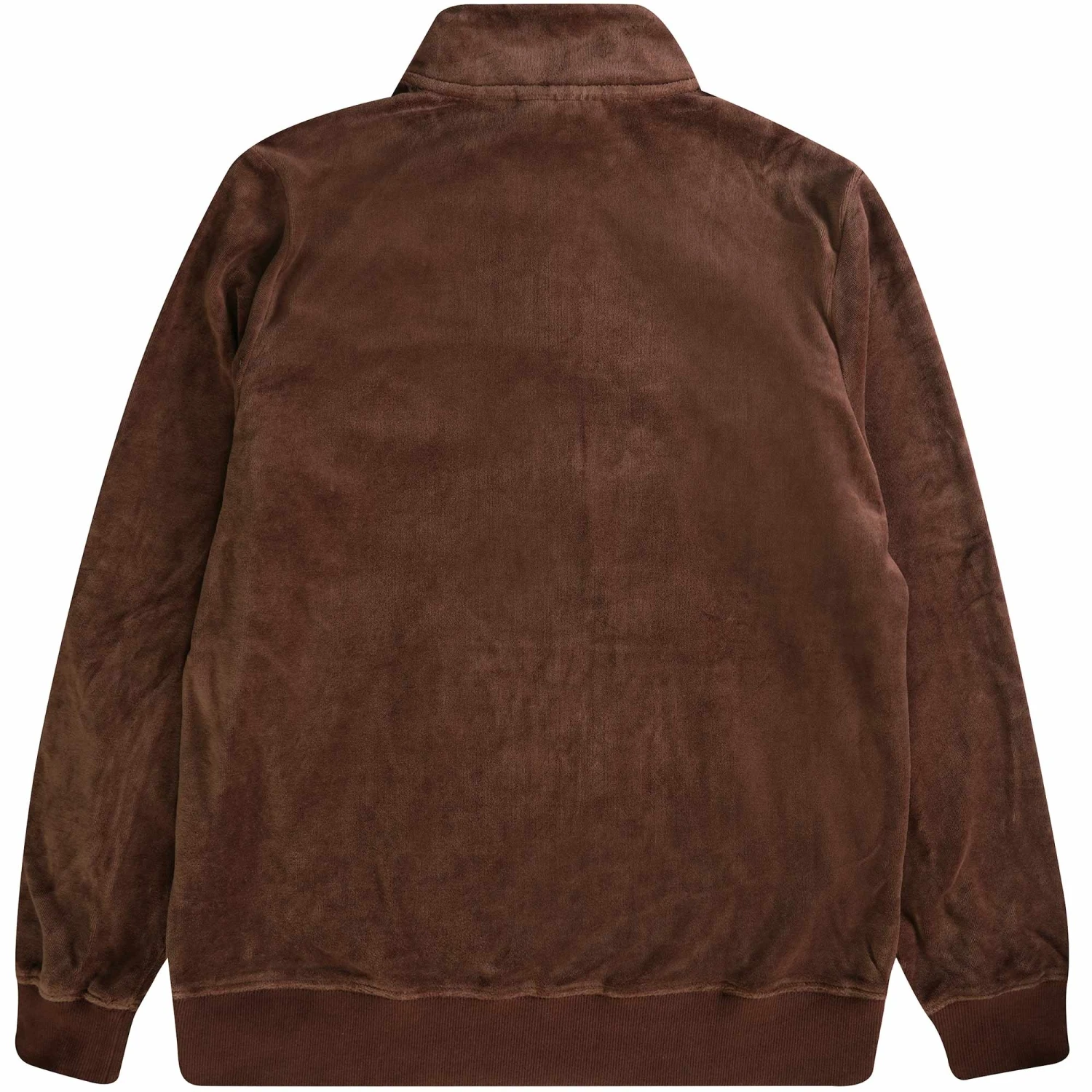 Fila Navy Vintage Duke Half Zip Sweatshirt An allover velour fabric pattern with a stand up collar and a half branded zip closing at the neck. Long sleeves with ribbed cuffs, a stretch ribbed waistline, and a kangaroo type pocket on the waist. A white woven trim runs down the sleeves and over the chest, with the distinctive Fila F logo patch embroidered in red, navy, and cream across the chest.