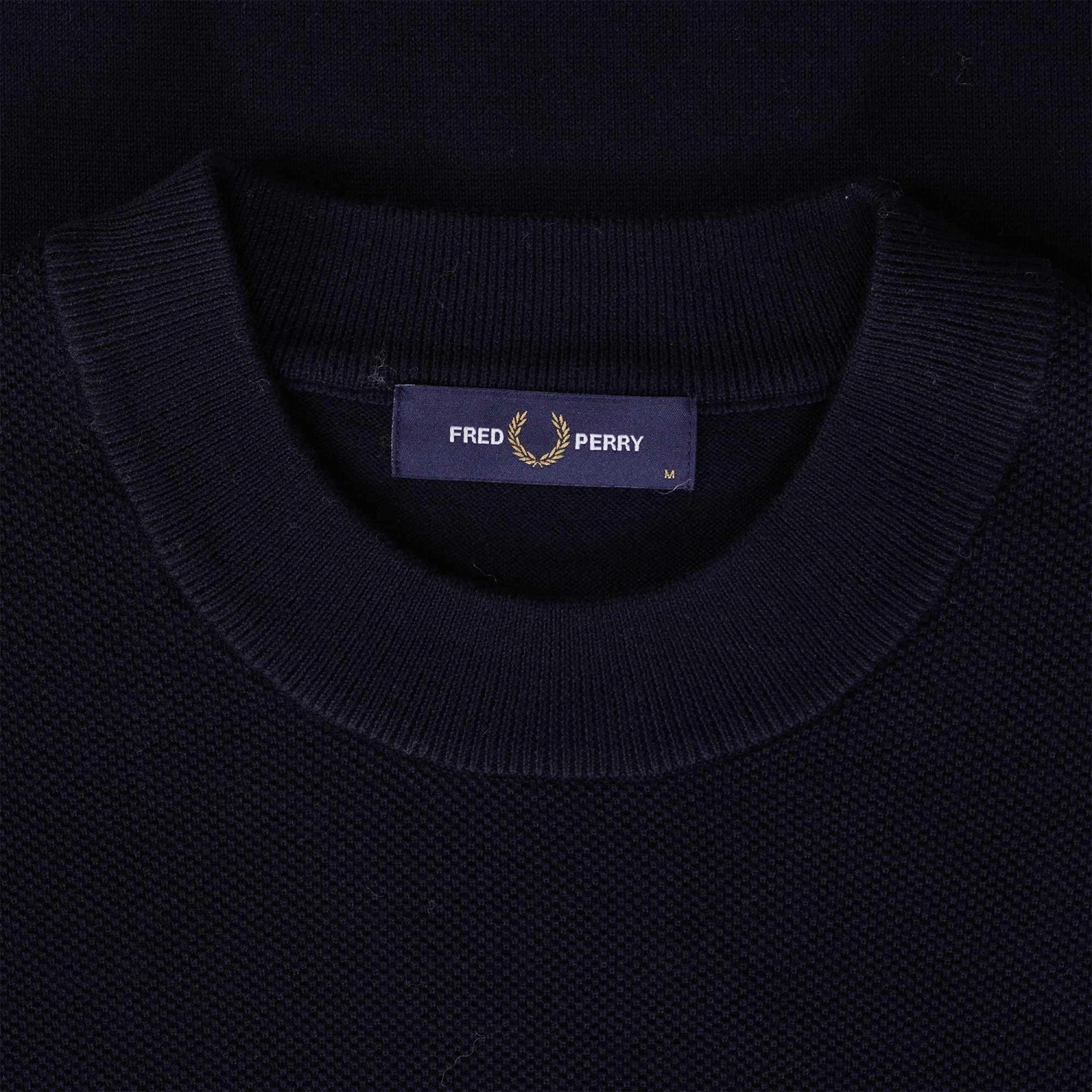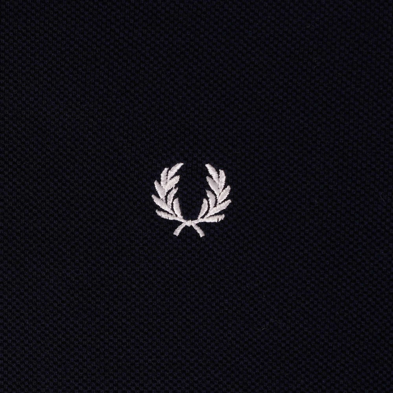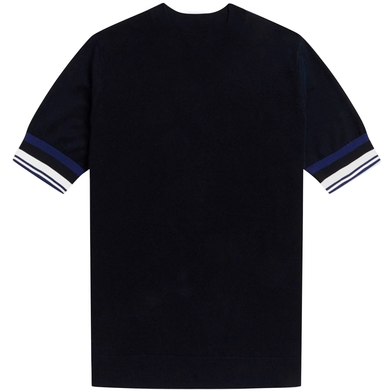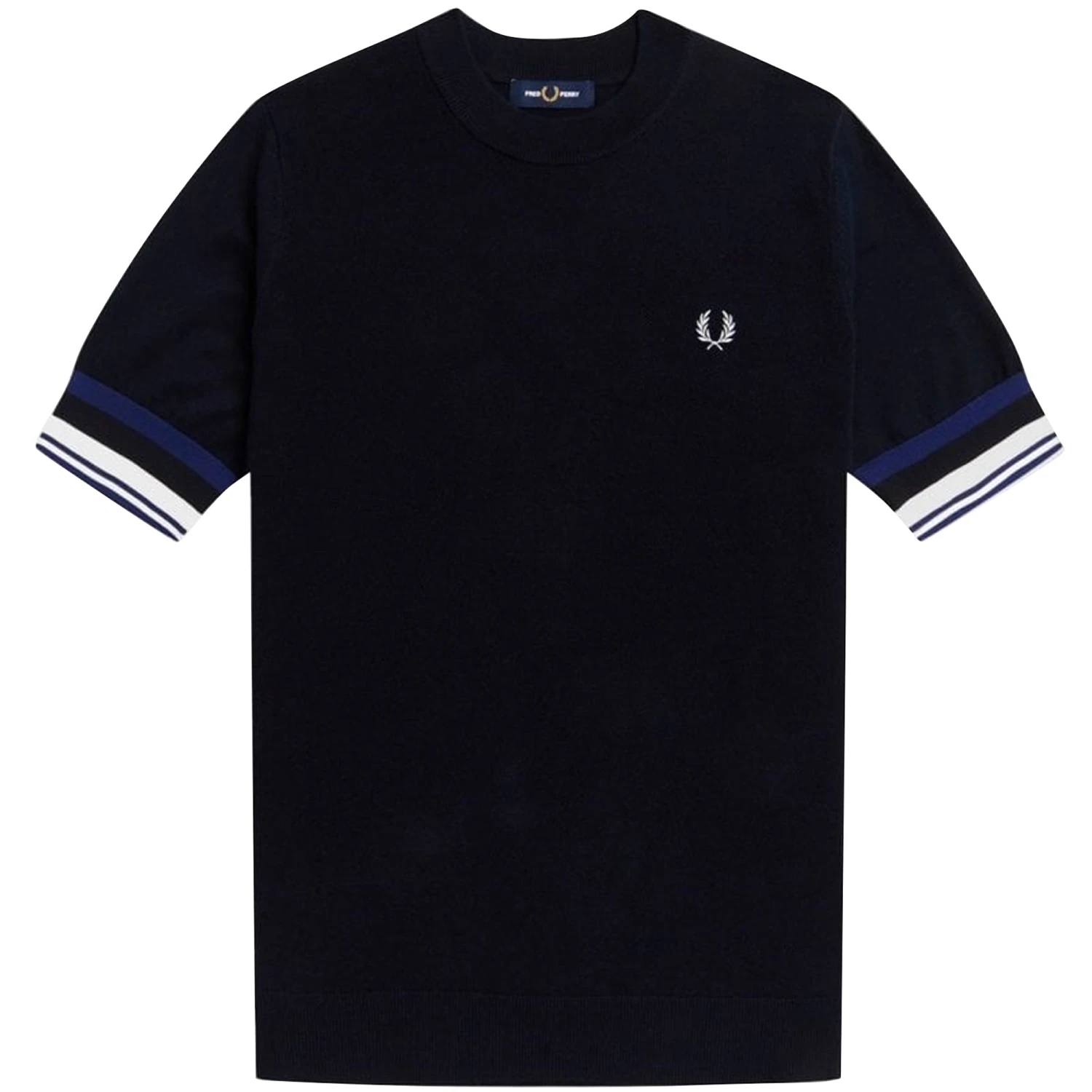 Black Fred Perry Bold Cuff Knitted Polo T Shirt. A soft knit all-over pattern and a textured ribbed crew neck. Short sleeves with ribbed cuffs and stripe detail in navy and white, as well as twin tipping in white and blue. The distinctive Fred Perry Laurel logo is embroidered in white on the left breast. A ribbed elasticised hem with black top stitching. Cotton only.