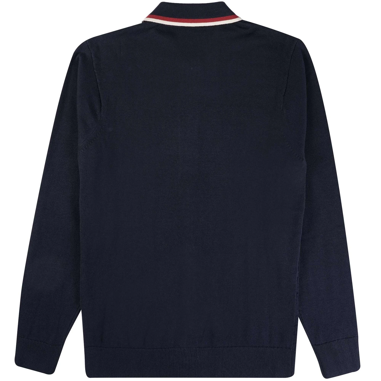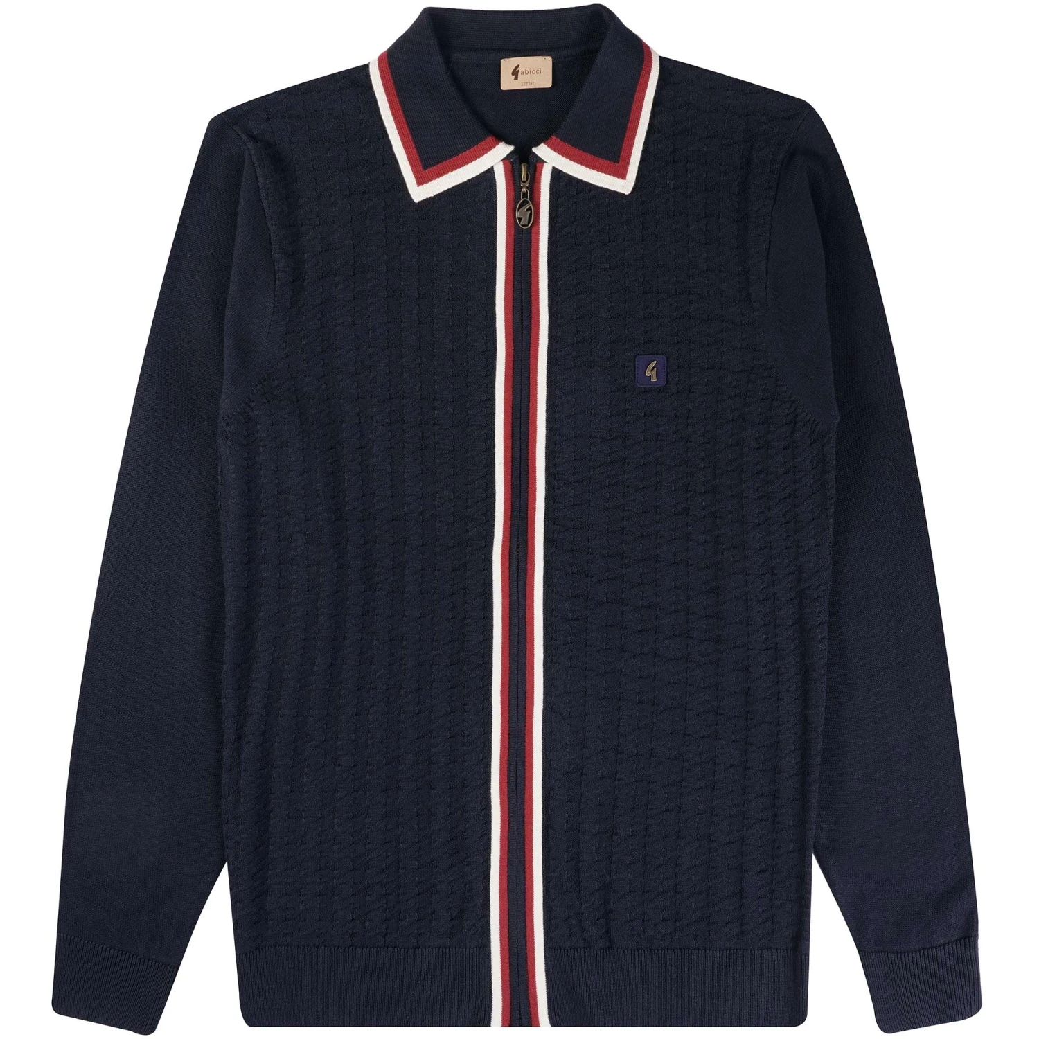 A long-sleeved, knitted cardigan-style shirt with a contrast rust hue on the collar and placket that has a tonal dogtooth design Has a branded zip pull and the trademark metal ‘G’ on the chest.