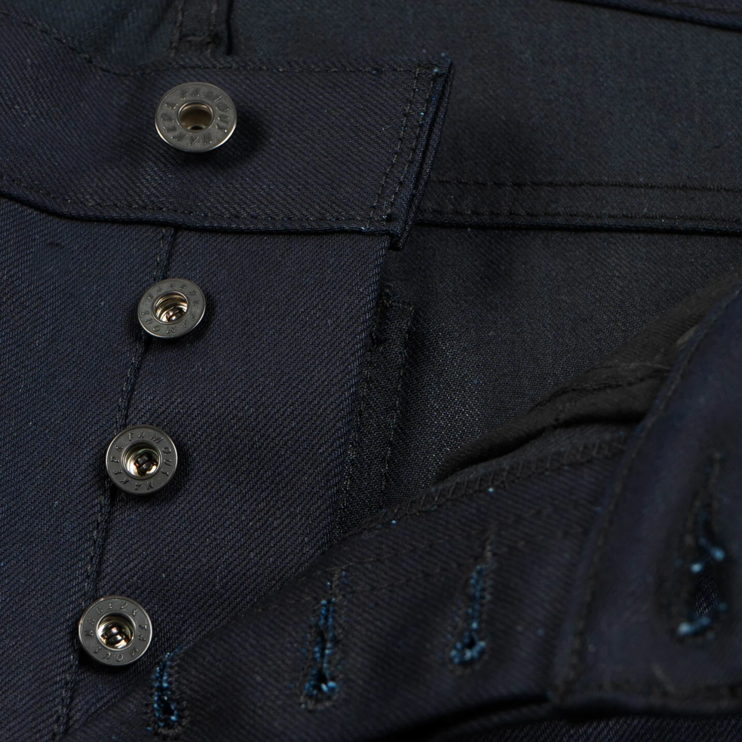 The Firewall Selvedge is a 13.5oz Japanese selvedge denim made with 35% flame-resistant carbon. In a special process acrylic fibers fired and carbonized. The result is a fiber with incredible resistance to flame and heat. Commonly used in fire fighter uniforms, and when super-heated becomes carbon fiber. Since the denim is a blend with cotton, they are not entirely flame resistant, so please do not set your legs on fire. However, they do make one bad ass pair of jeans. Other details include tonal stitching, black buffalo leather patch, classic red line selvedge ID, black military spec non reflective buttons and rivets.