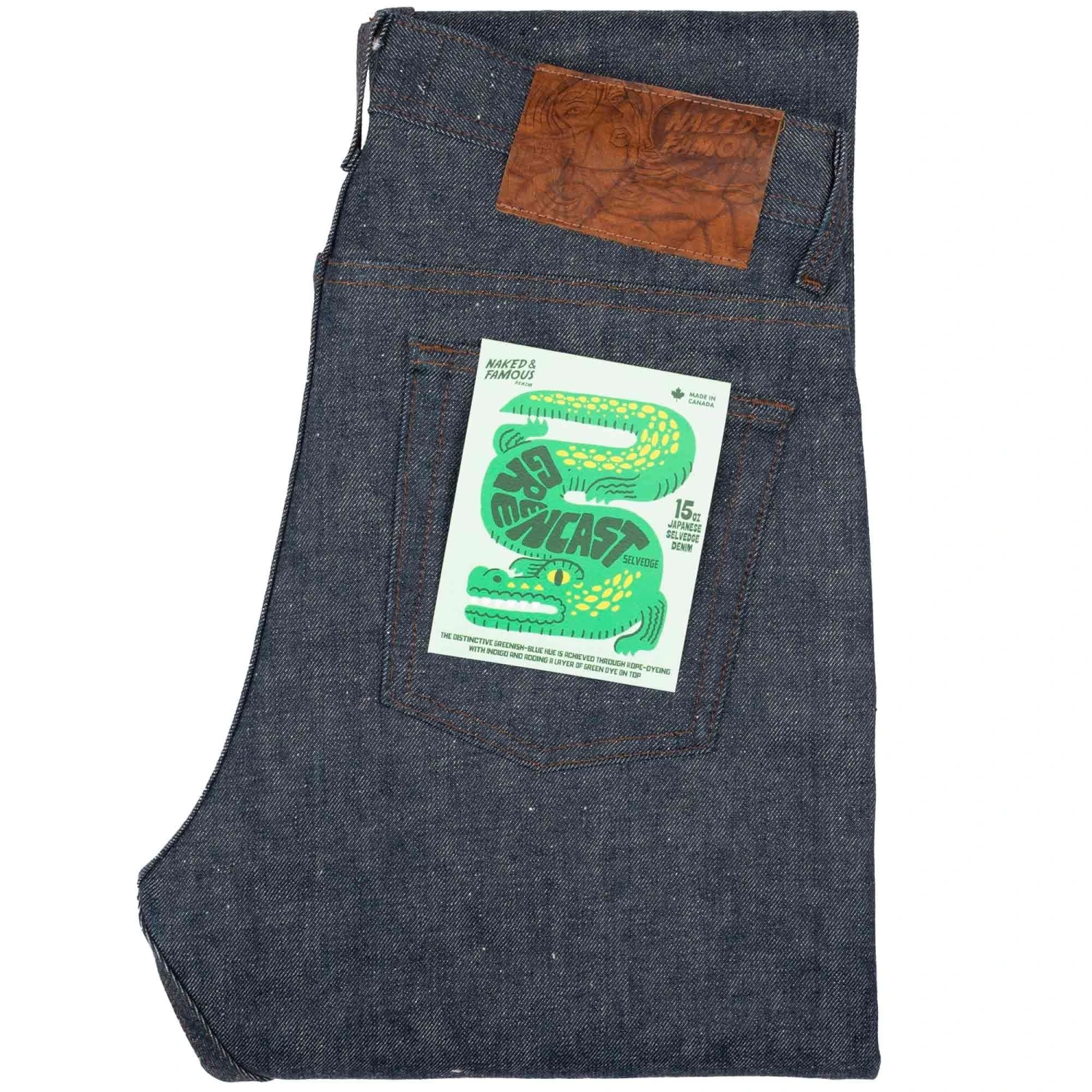 The Greencast Slub Selvedge is a midweight 15oz Japanese Selvedge Denim with a stunning colour and texture. It’s signature greenish-blue hue is achieved through “top dying”, the yarns are first rope dyed with indigo and then dyed once again and finished with a green dye on top. The yarns themselves are slub yarns, which are uneven in size and add texture and nuance to the fabric. Since the yarns are uneven and absorb different amounts of indigo, you’ll see different hues throughout the fabric, adding to its character. The denim also features indigo and white neps, which are small knots present in the yarn that show up as spots in the fabric. These details, which may have been considered imperfections in vintage jeans, are now seen as throwback details that are particularly apparent when you flip the cuff and look at the inside of the fabric. Other details include a hidden selvedge coin pocket, button fly, antique copper hardware, contrast stitching, and a faded redline selvedge ID. The jeans are cut and sewn in Canada and have a rigid feel, but will only require a short amount of break-in time.