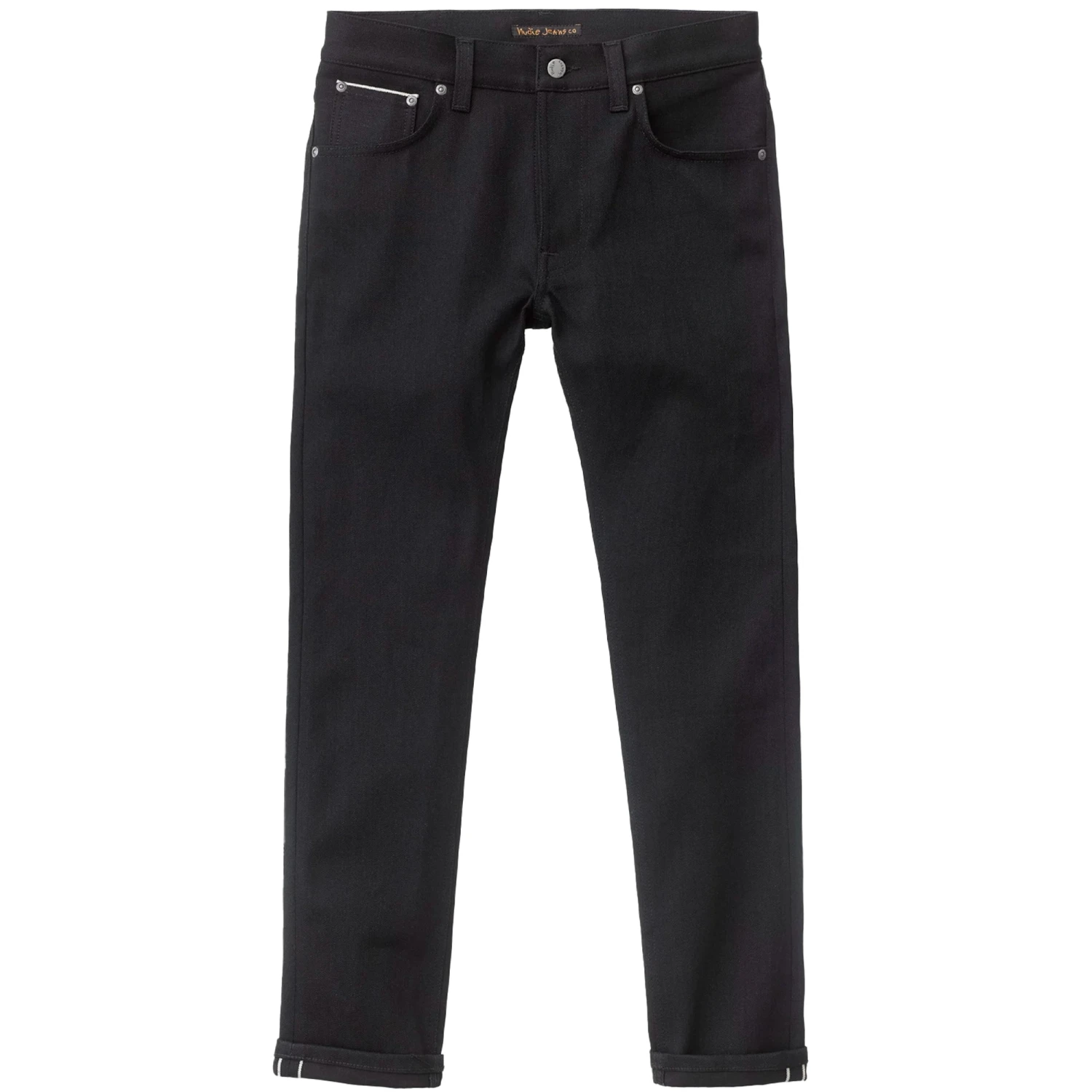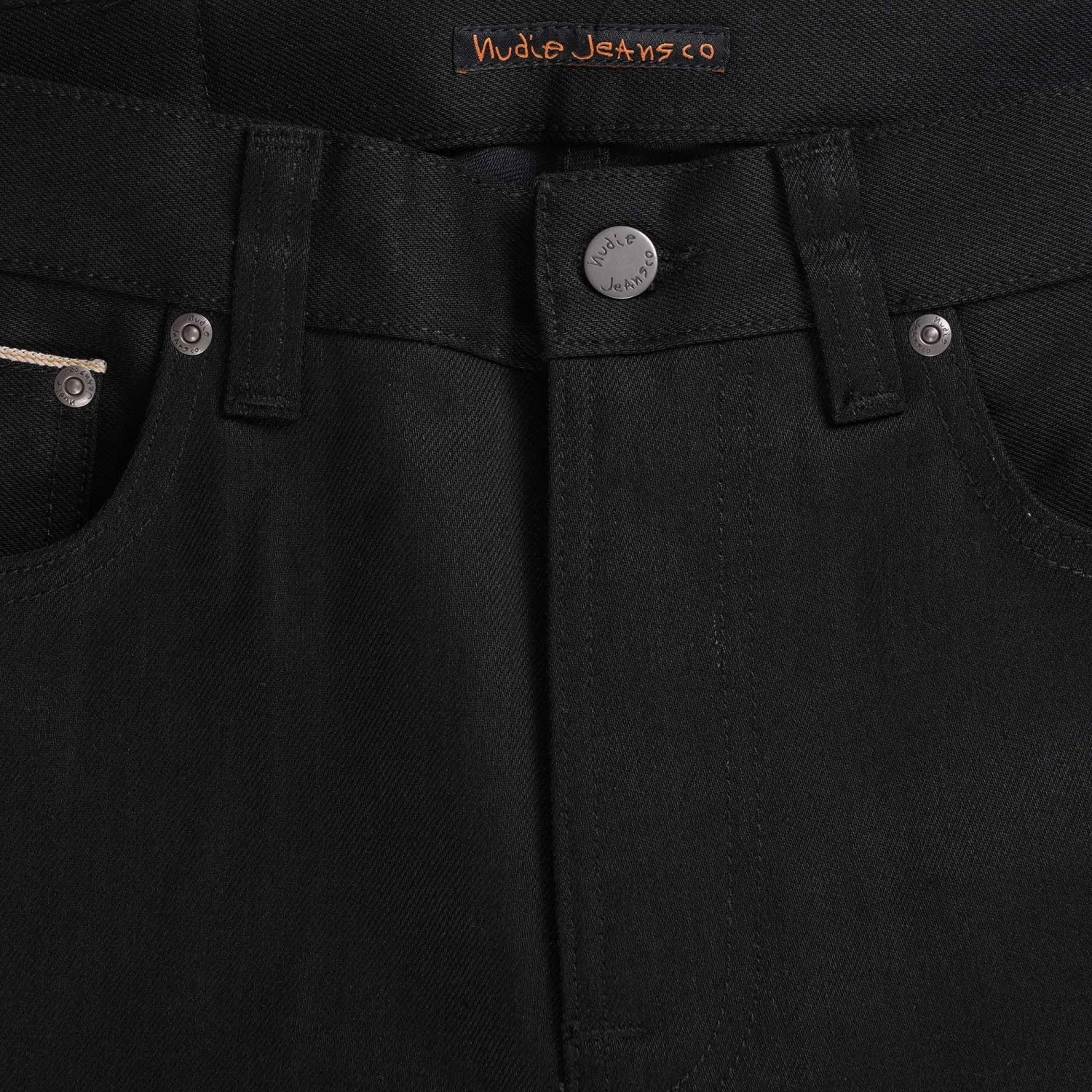 Without a doubt a favourite of Nudie Jeans- the almighty Lean Dean in a crispy dry black comfort stretch selvage denim. Weighing in at 12.75 oz. the denim is nicely coupled with Dean’s slim fit. The starch in the denim gives it its crispy hand and, most importantly, generates pronounced creases on the jeans when worn – allowing for some contrasting moustaches and honeycombs. The denim itself is woven on old school shuttle looms with yarns that have been yarn dyed. The shuttle looms interlace the yarns into the selvage denim and the yarn dying keeps the core of the yarns white allowing the weave to fade beautifully – a slow process that reflects how denim was made back in the day. The finished denim has a clear twill structure which is nicely balanced by a slight slub character which with wear and washing will get more pronounced in a perfectly imperfect way.