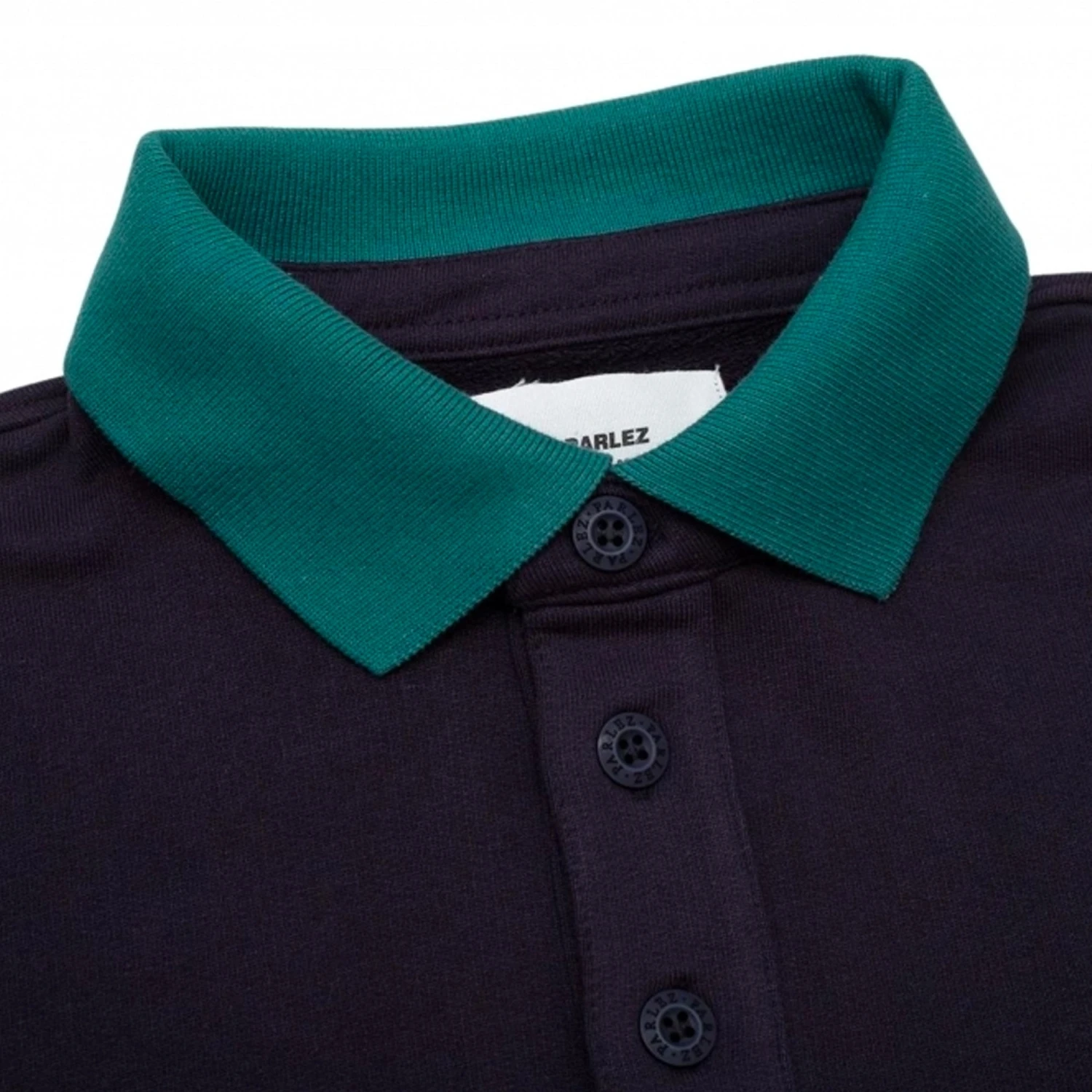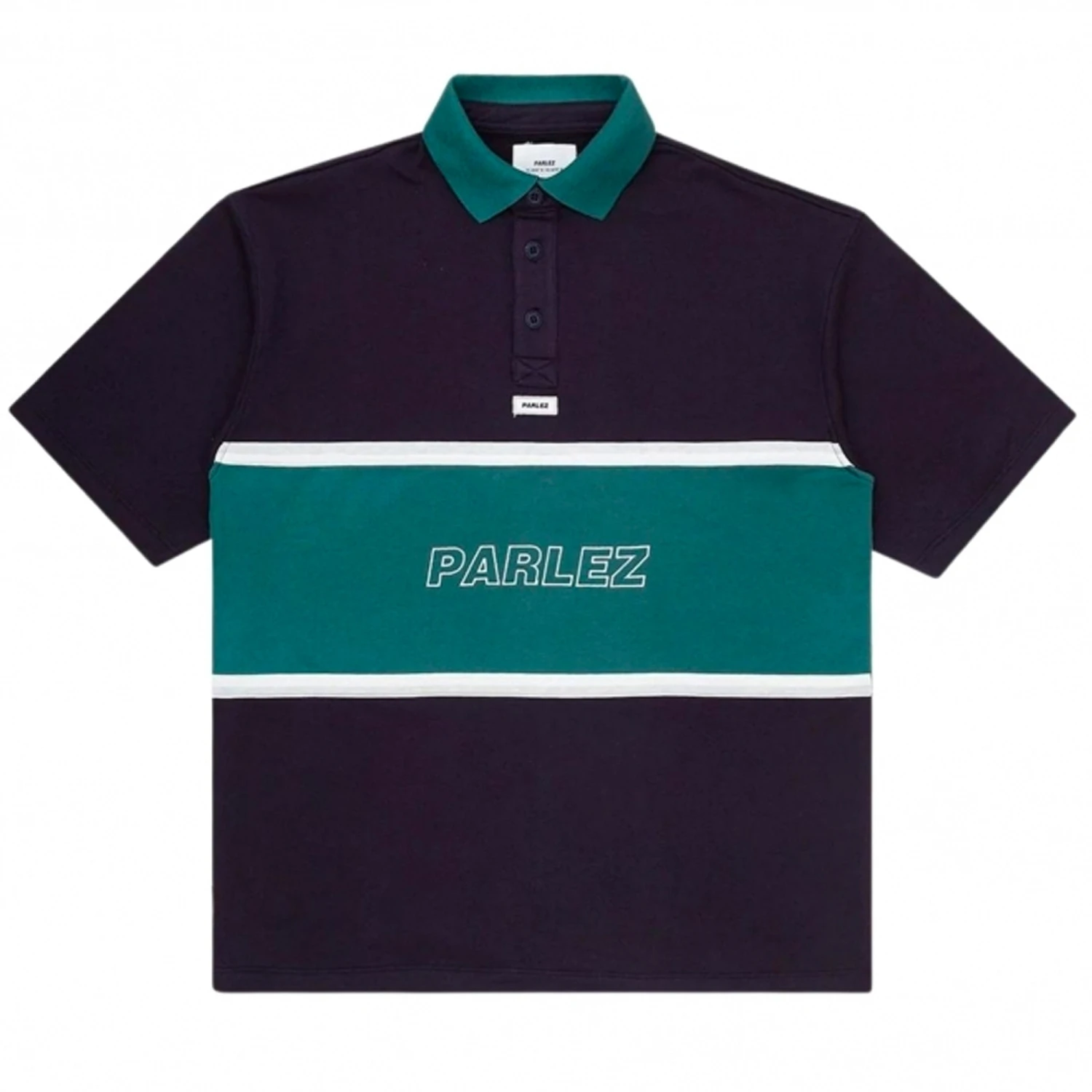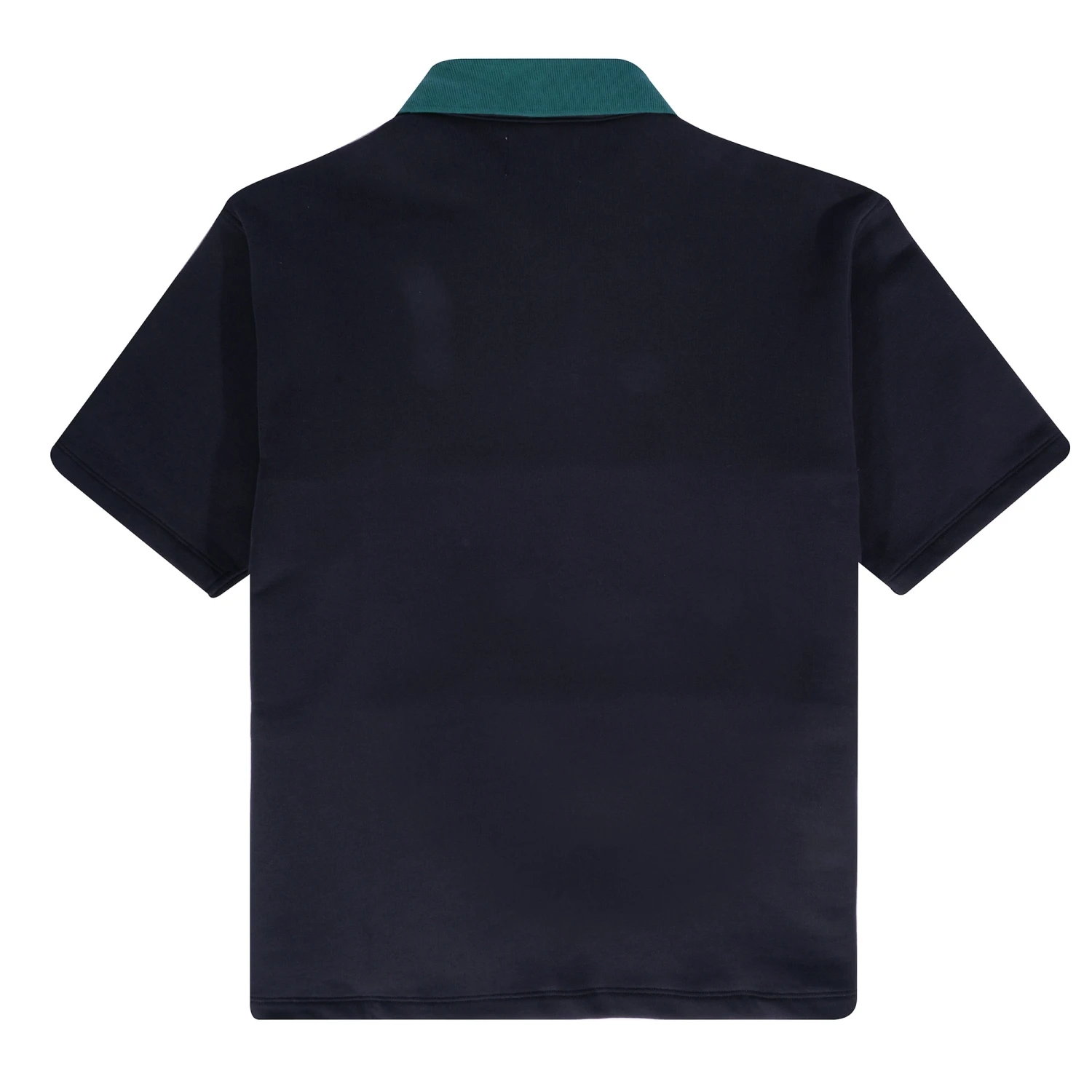 The Blake Short Sleeve T-Shirt in Navy. A short sleeve Rugby silhouette constructed from an organic and recycled loopback cotton blend. Featuring a button-down placket with a contrasting chest panel and collar. Detailed with a woven side seam label and embroidered branding.