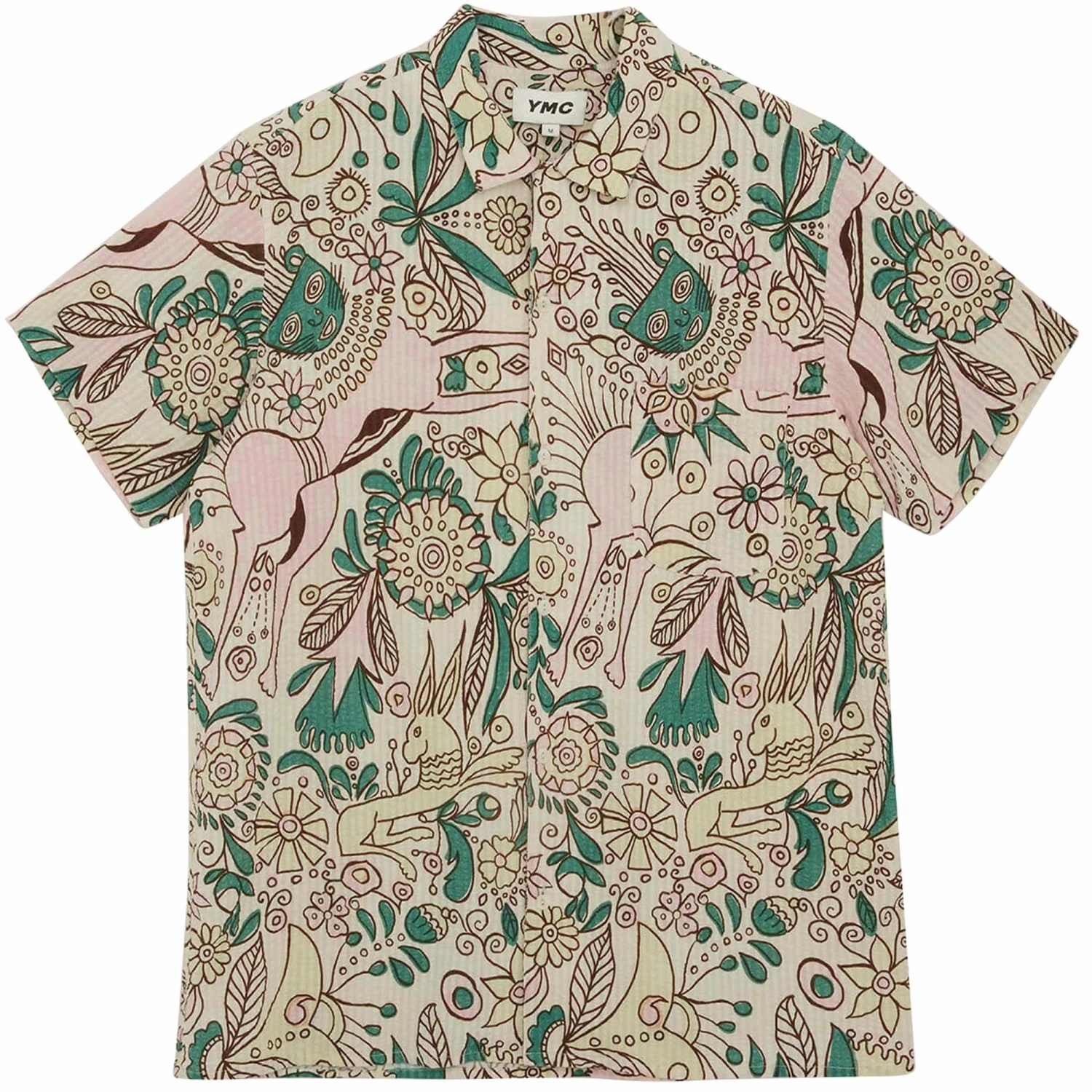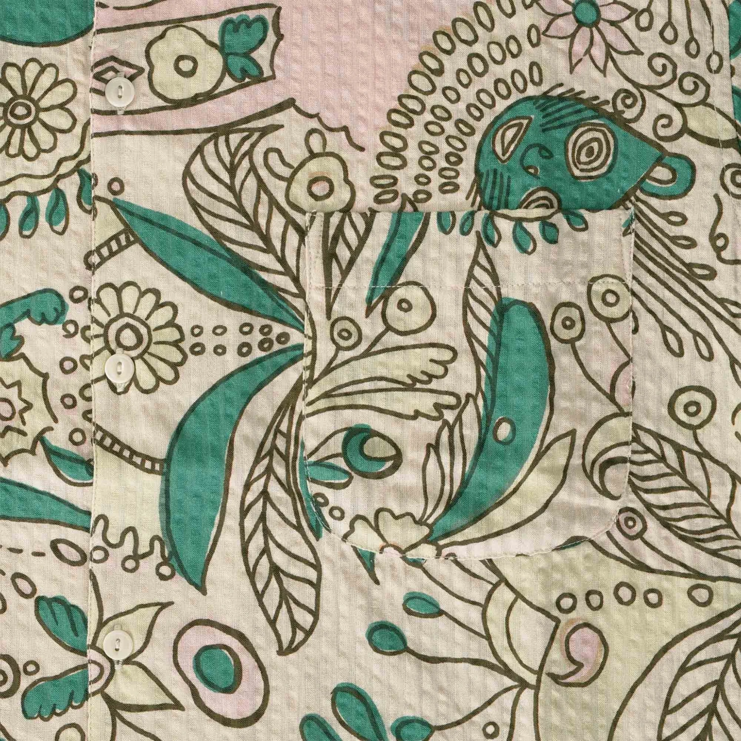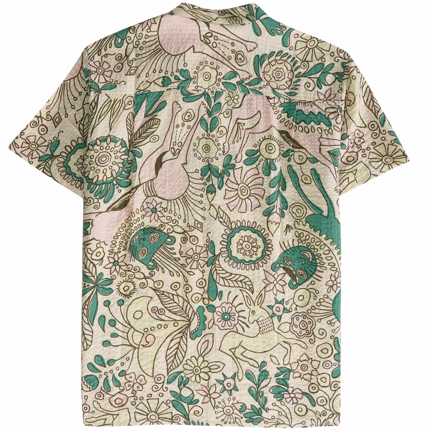 Short-sleeved Cuban collar shirt in a pure cotton seersucker with a wild seasonal print. A laid-back, loose fit that draws on the controlled chaos of Terrence Malick’s Badlands.